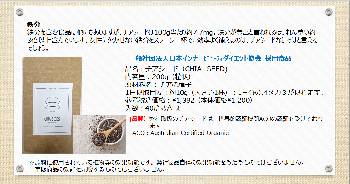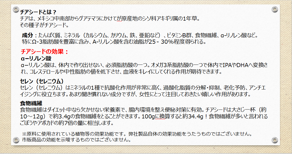 d:鉄分:チアシードは100gあたり約7.7㎎含まれています。ほうれん草の約3倍に相当します。
